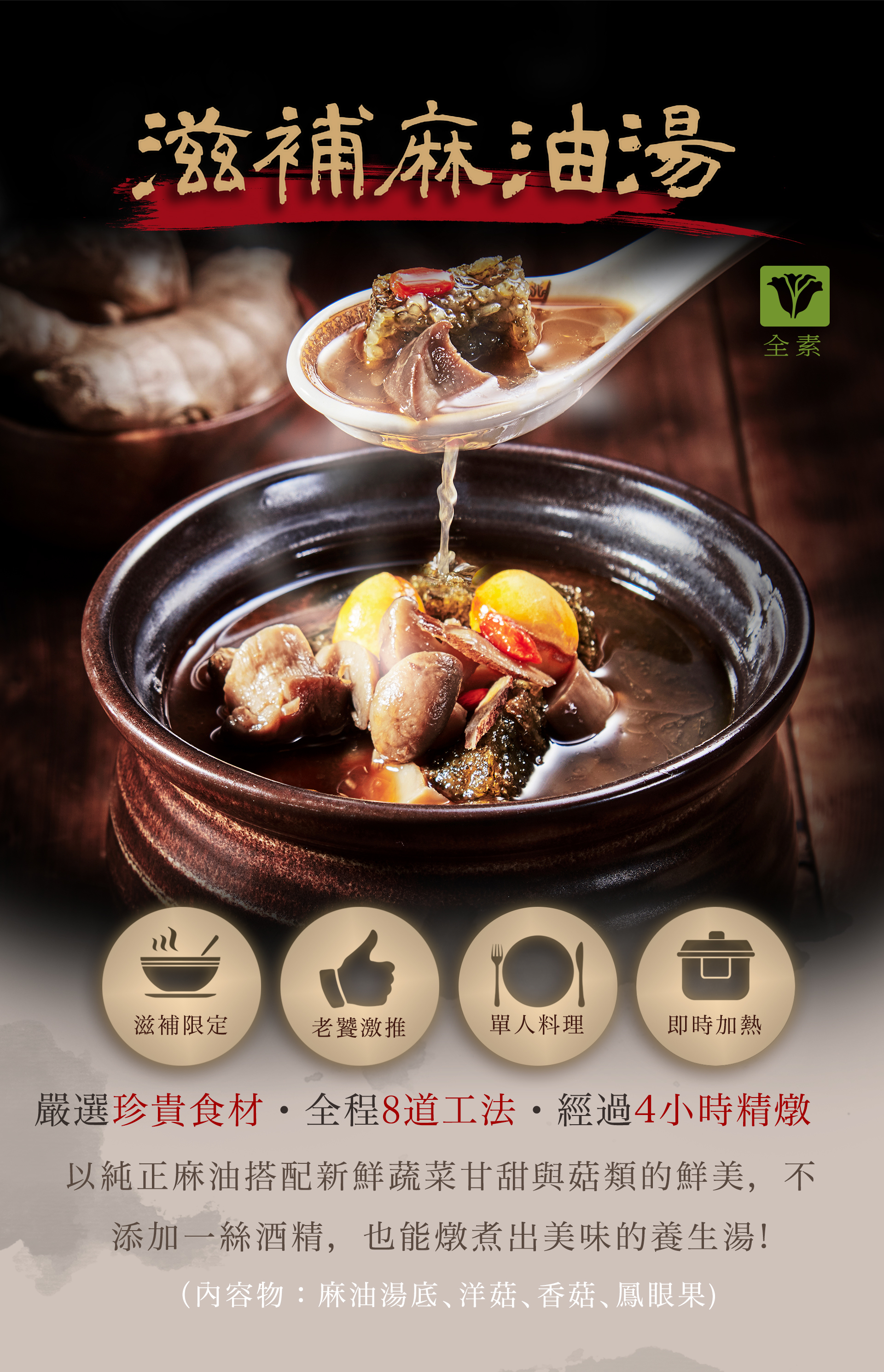 介紹:以純正麻油、搭配新鮮蔬菜甘甜與菇類的鮮美,不添加一絲酒精,也能燉煮美味的養生湯保存方式:冷凍-18度以下保存,不建議二次退冰,解凍後請盡快食用完畢